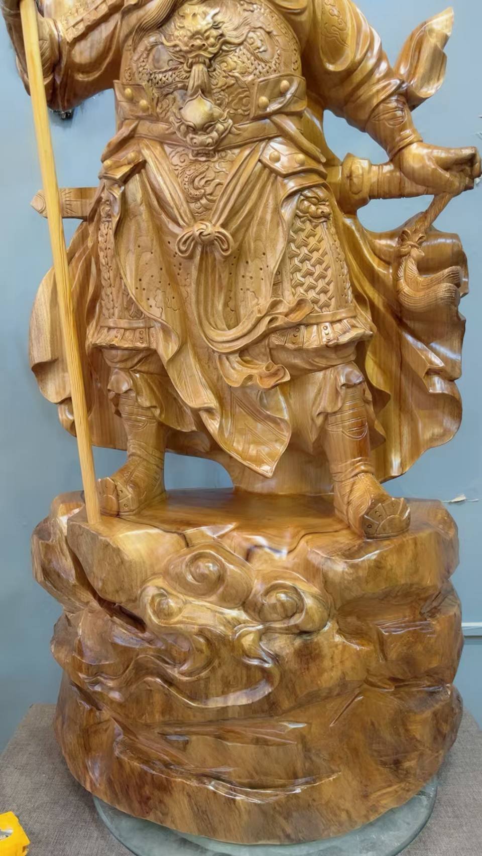 ชิ้นงานแกะสลัก Handmade ล้วนๆ จากไม้หอมการบูรท่อนเดียว ลายและสีของไม้มีความสม่ำเสมอ สวยมาก ในส่วนของรายละเอียดงานแกะสลักทำได้อย่างยอดเยี่ยม ทั้งใบหน้าอากงหล่อคมเข้ม มุ่งมั่นหนักแน่น เกล็ดชุดเกราะเรียงสวยงาม สัดส่วนท่วงท่าดีมาก สวยสง่างามพลังเต็มเปี่ยมมากค่ะ